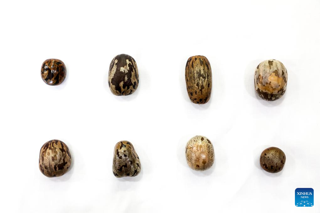 This photo taken on June 20, 2024 shows seeds of different varieties of rubber trees at a compound under the Chinese Academy of Tropical Agricultural Sciences in Danzhou, south China's Hainan Province. Thanks to efforts by three generations of Chinese researchers, the rubber tree breeding cycle in the country has been shortened from 41 years to 27 years, and eight high-yielding rubber tree varieties that are cold-resistant and wind-resistant have been bred. (Xinhua/Zhang Liyun)