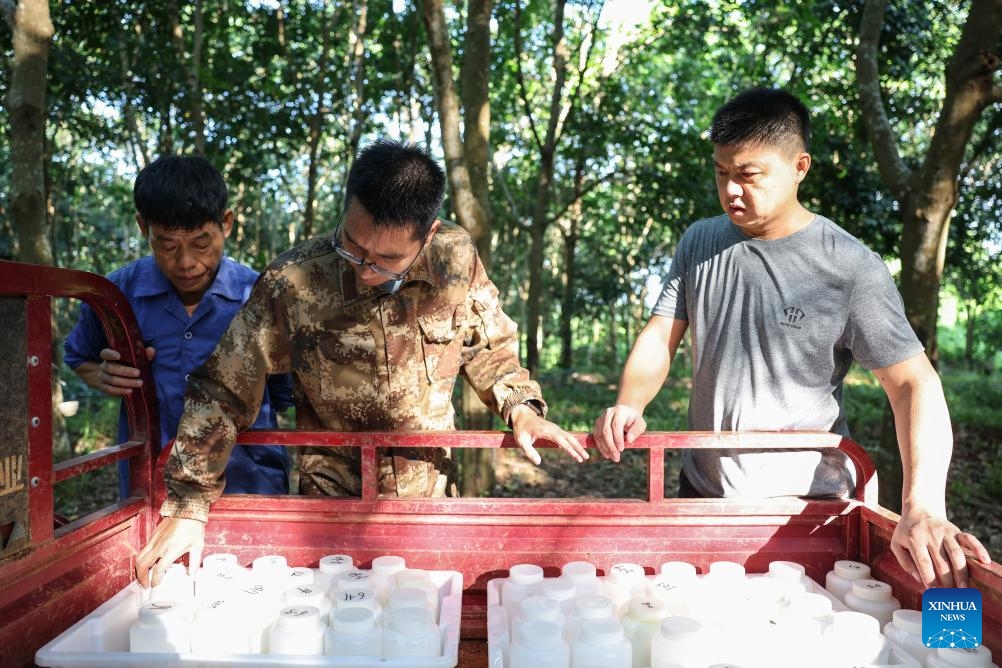 A researcher of Rubber Research Institute under Chinese Academy of Tropical Agricultural Sciences works at a rubber plantation in Danzhou, south China's Hainan Province, June 20, 2024. Thanks to efforts by three generations of Chinese researchers, the rubber tree breeding cycle in the country has been shortened from 41 years to 27 years, and eight high-yielding rubber tree varieties that are cold-resistant and wind-resistant have been bred. (Xinhua/Zhang Liyun)