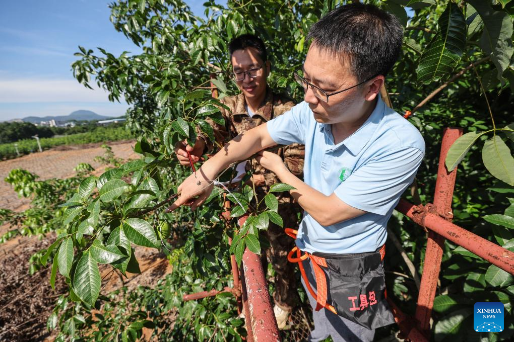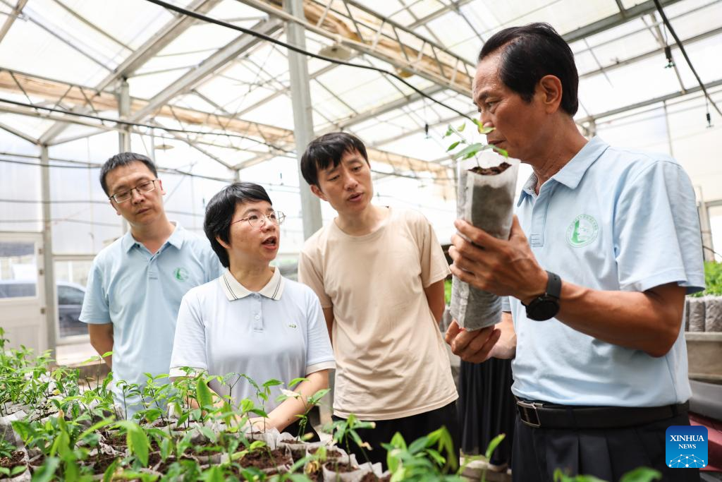 Researchers of Chinese Academy of Tropical Agricultural Sciences check a rubber tree seedling at a greenhouse under the academy in Danzhou, south China's Hainan Province, June 20, 2024. Thanks to efforts by three generations of Chinese researchers, the rubber tree breeding cycle in the country has been shortened from 41 years to 27 years, and eight high-yielding rubber tree varieties that are cold-resistant and wind-resistant have been bred. (Xinhua/Zhang Liyun)
