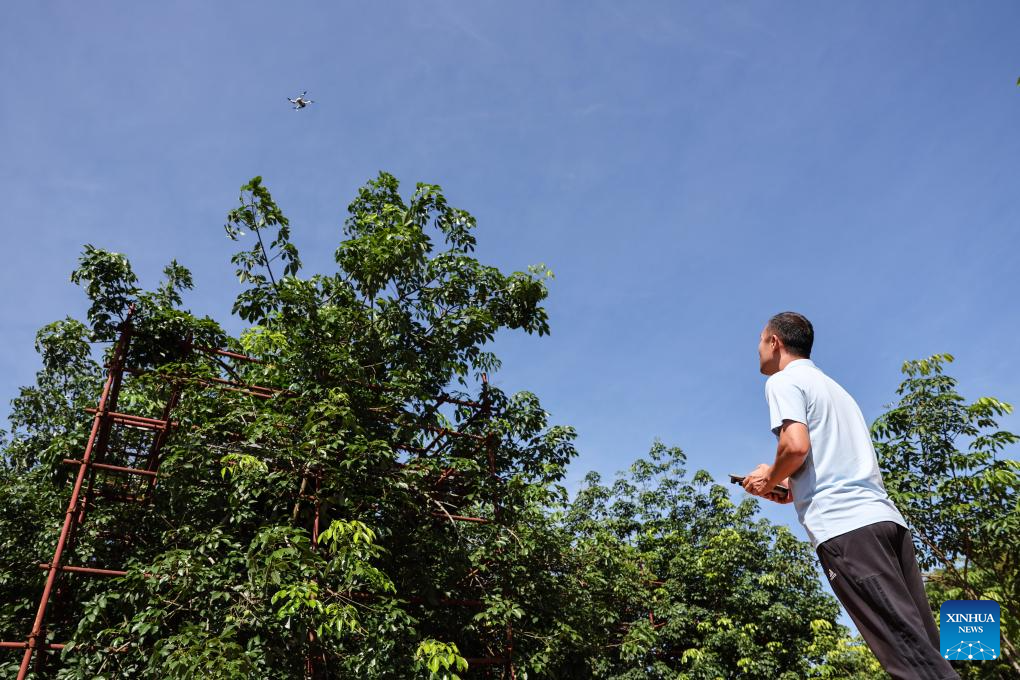 A researcher of Rubber Research Institute under Chinese Academy of Tropical Agricultural Sciences operates a drone for observation at a rubber plantation in Danzhou, south China's Hainan Province, June 20, 2024. Thanks to efforts by three generations of Chinese researchers, the rubber tree breeding cycle in the country has been shortened from 41 years to 27 years, and eight high-yielding rubber tree varieties that are cold-resistant and wind-resistant have been bred. (Xinhua/Zhang Liyun)