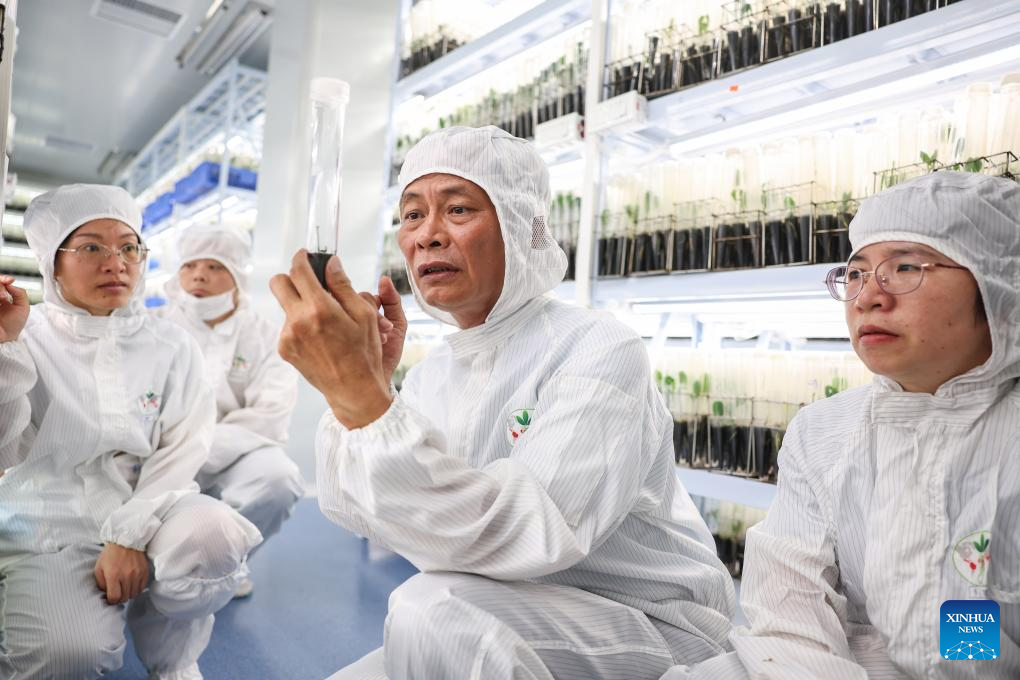 Researchers of Chinese Academy of Tropical Agricultural Sciences check a rubber tree seedling cultivated inside a test tube at a compound under the academy in Danzhou, south China's Hainan Province, June 20, 2024. Thanks to efforts by three generations of Chinese researchers, the rubber tree breeding cycle in the country has been shortened from 41 years to 27 years, and eight high-yielding rubber tree varieties that are cold-resistant and wind-resistant have been bred. (Xinhua/Zhang Liyun)