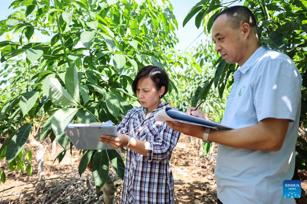Researchers of Rubber Research Institute under Chinese Academy of Tropical Agricultural Sciences work at a rubber plantation in Danzhou, south China's Hainan Province, June 20, 2024. Thanks to efforts by three generations of Chinese researchers, the rubber tree breeding cycle in the country has been shortened from 41 years to 27 years, and eight high-yielding rubber tree varieties that are cold-resistant and wind-resistant have been bred. (Xinhua/Zhang Liyun)