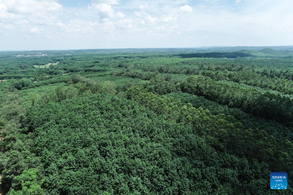 An aerial drone photo shows a rubber plantation under the Chinese Academy of Tropical Agricultural Sciences in Danzhou, south China's Hainan Province, June 20, 2024. Thanks to efforts by three generations of Chinese researchers, the rubber tree breeding cycle in the country has been shortened from 41 years to 27 years, and eight high-yielding rubber tree varieties that are cold-resistant and wind-resistant have been bred. (Xinhua/Zhang Liyun)
