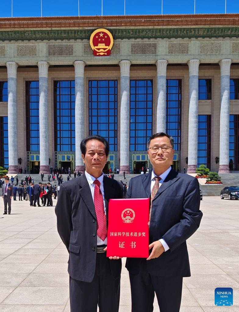 Huang Huasun (L), a leading scientist in China's natural rubber industry, and Li Weiguo, a researcher of Rubber Research Institute under Chinese Academy of Tropical Agricultural Sciences, pose for photo with the certificate for the State Scientific and Technological Progress Award outside the Great Hall of the People in Beijing, capital of China, June 24, 2024. Thanks to efforts by three generations of Chinese researchers, the rubber tree breeding cycle in the country has been shortened from 41 years to 27 years, and eight high-yielding rubber tree varieties that are cold-resistant and wind-resistant have been bred. (Xinhua)