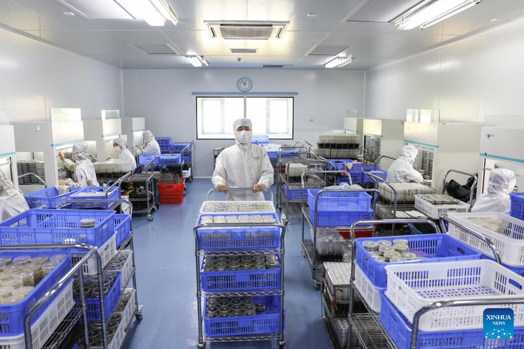 Researchers of Chinese Academy of Tropical Agricultural Sciences operate inside a workshop at a compound under the academy in Danzhou, south China's Hainan Province, June 20, 2024. Thanks to efforts by three generations of Chinese researchers, the rubber tree breeding cycle in the country has been shortened from 41 years to 27 years, and eight high-yielding rubber tree varieties that are cold-resistant and wind-resistant have been bred. (Xinhua/Zhang Liyun)