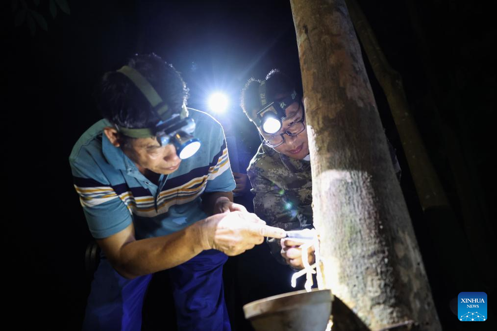 Researchers of Rubber Research Institute under Chinese Academy of Tropical Agricultural Sciences collect latex at a rubber plantation in Danzhou, south China's Hainan Province, June 20, 2024. Thanks to efforts by three generations of Chinese researchers, the rubber tree breeding cycle in the country has been shortened from 41 years to 27 years, and eight high-yielding rubber tree varieties that are cold-resistant and wind-resistant have been bred. (Xinhua/Zhang Liyun)