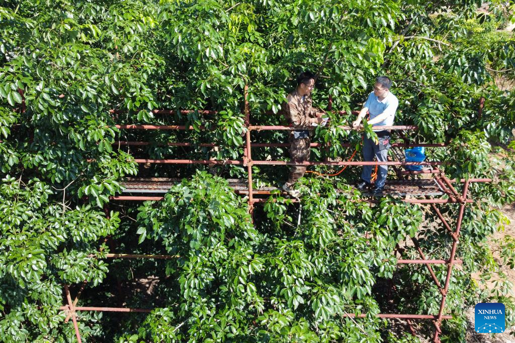 A drone photo shows researchers of Rubber Research Institute under Chinese Academy of Tropical Agricultural Sciences working at a rubber plantation in Danzhou, south China's Hainan Province, June 20, 2024. Thanks to efforts by three generations of Chinese researchers, the rubber tree breeding cycle in the country has been shortened from 41 years to 27 years, and eight high-yielding rubber tree varieties that are cold-resistant and wind-resistant have been bred. (Xinhua/Zhang Liyun)
