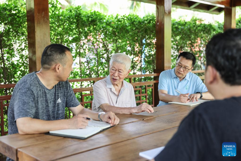 Wu Yuntong (2nd L), an expert on rubber tree breeding, talks with researchers of Chinese Academy of Tropical Agricultural Sciences at a compound under the academy in Haikou, south China's Hainan Province, June 19, 2024. Thanks to efforts by three generations of Chinese researchers, the rubber tree breeding cycle in the country has been shortened from 41 years to 27 years, and eight high-yielding rubber tree varieties that are cold-resistant and wind-resistant have been bred. (Xinhua/Zhang Liyun)