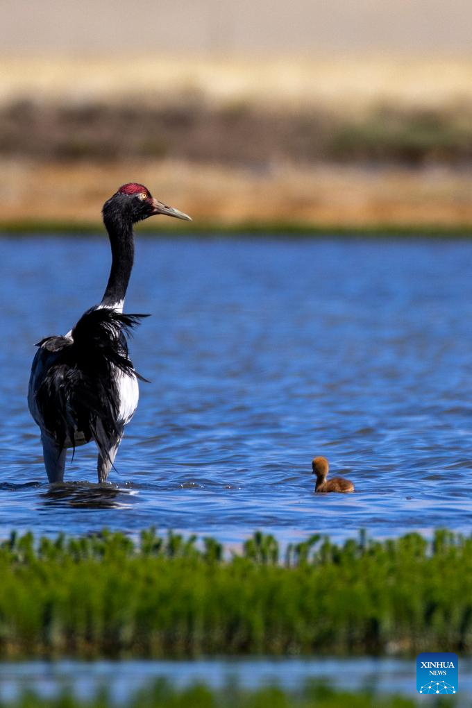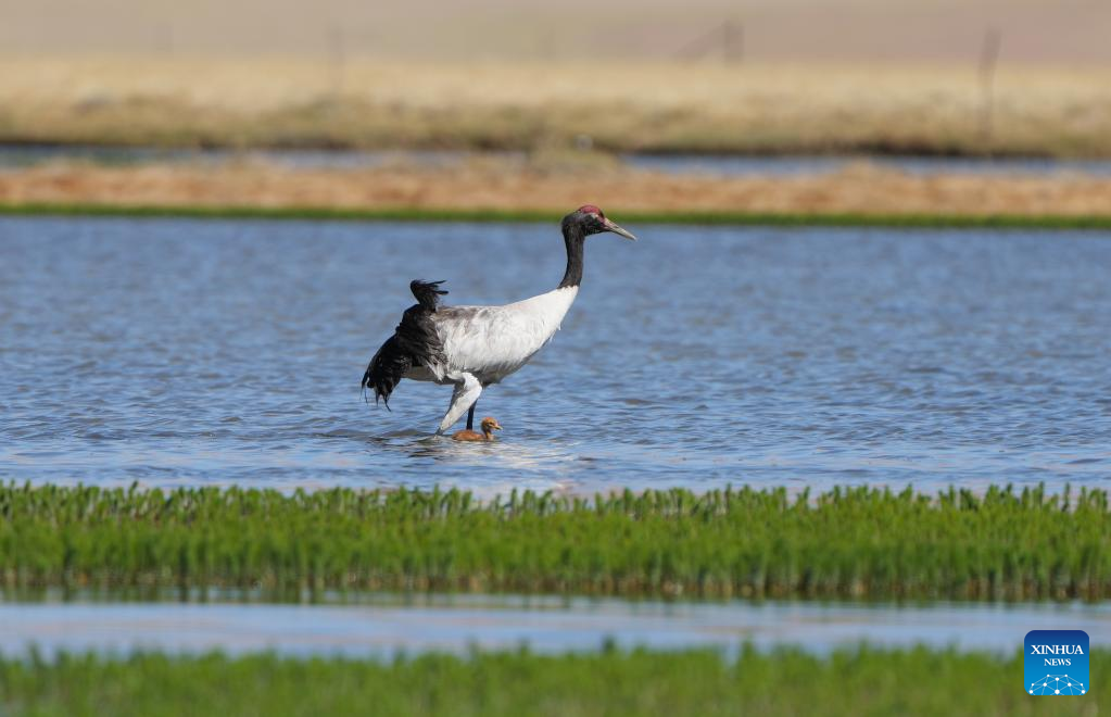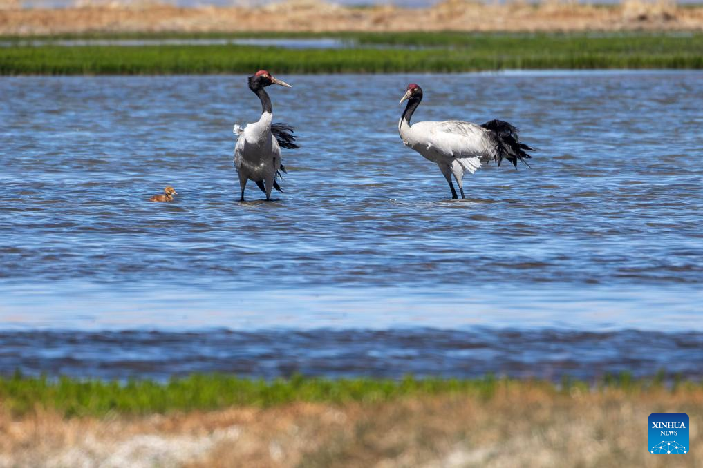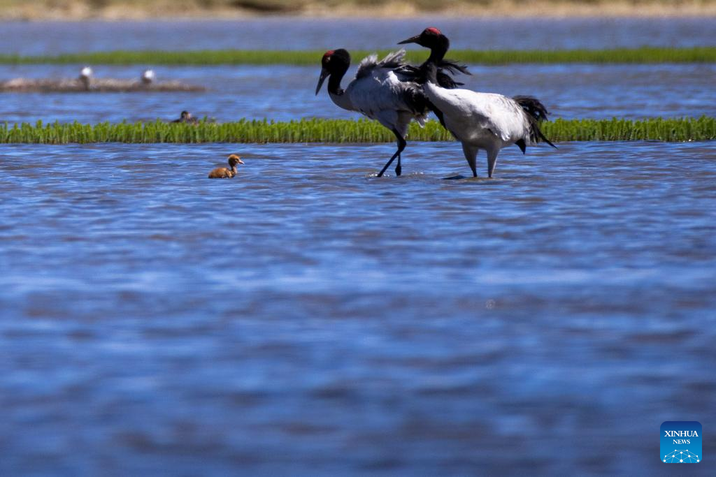 Black-necked cranes are pictured in Xainza County of Nagqu City, southwest China's Xizang Autonomous Region, June 9, 2024. (Xinhua/Tenzing Nima Qadhup)