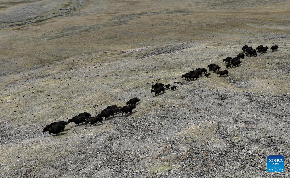 An aerial drone photo taken on June 15, 2024 shows herds of wild yaks in Nyima County of Nagqu City, southwest China's Xizang Autonomous Region. (Xinhua/Tenzing Nima Qadhup)