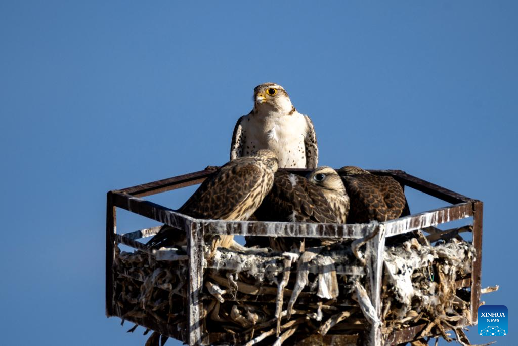 Peregrine falcons are pictured in Nyima County of Nagqu City, southwest China's Xizang Autonomous Region, June 13, 2024. (Xinhua/Jiang Fan)