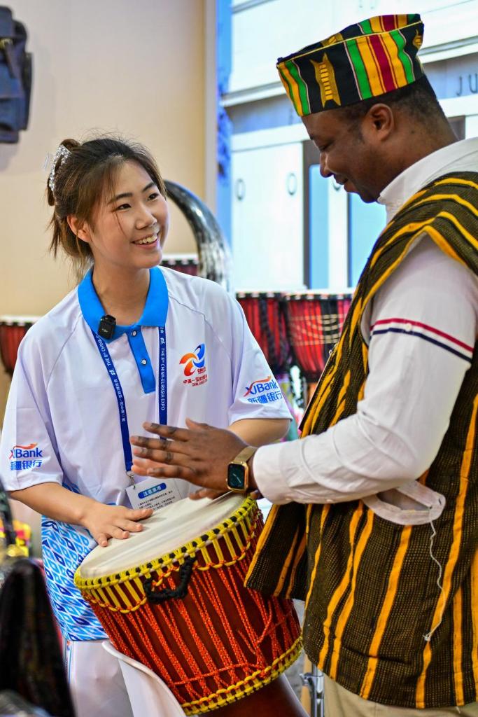 A volunteer learns to play a drum at the booth of Ghana at the 8th China-Eurasia Expo in Urumqi, northwest China's Xinjiang Uygur Autonomous Region, June 26, 2024. (Xinhua/Ding Lei)