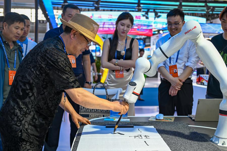 A visitor interacts with a robot at the booth of Shandong Province at the 8th China-Eurasia Expo in Urumqi, northwest China's Xinjiang Uygur Autonomous Region, June 26, 2024. (Xinhua/Chen Shuo)