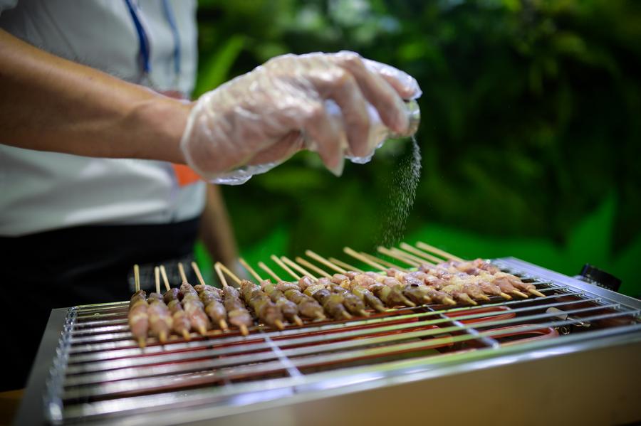 A staff member grills lamb kebabs at the 8th China-Eurasia Expo in Urumqi, northwest China's Xinjiang Uygur Autonomous Region, June 26, 2024. (Xinhua/Li Renzi)