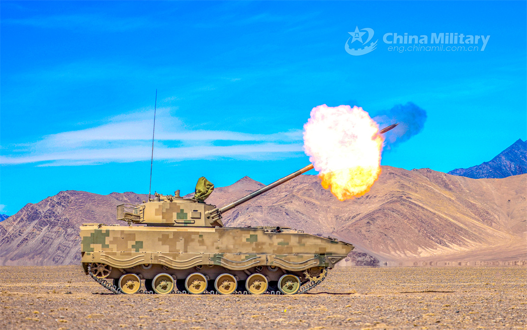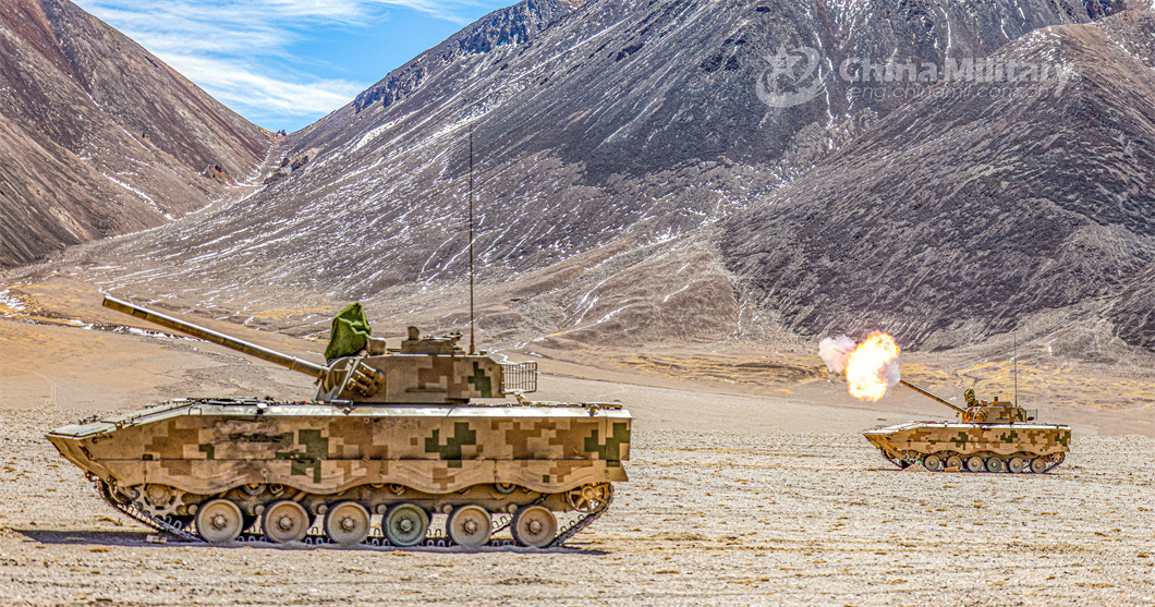A main battle tank attached to a striking detachment of a regiment under the PLA Xinjiang Military Command fires at a mock target during a live-fire shooting test in early June, 2024. (eng.chinamil.com.cn/Photo by Zhang Xin)