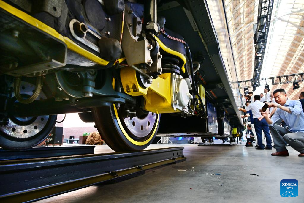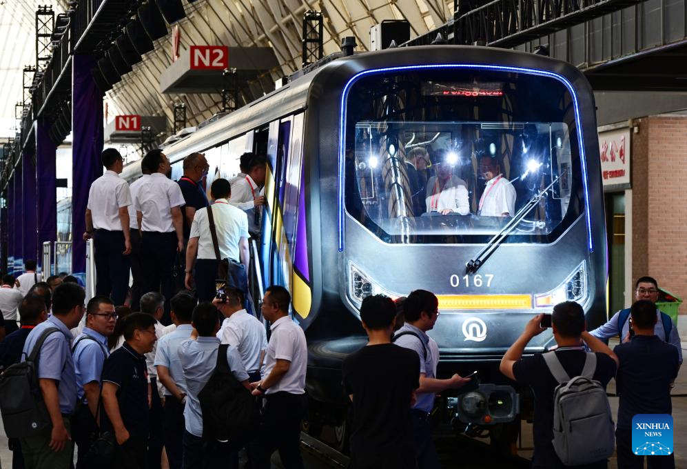 A CETROVO 1.0 subway car is on display in Qingdao, east China's Shandong Province, June 26, 2024. The CETROVO 1.0 subway car was launched in Qingdao on Wednesday. With a carbon fiber composite body and frame, it is lighter and more energy-efficient than the traditional subway train. (Xinhua/Li Ziheng)