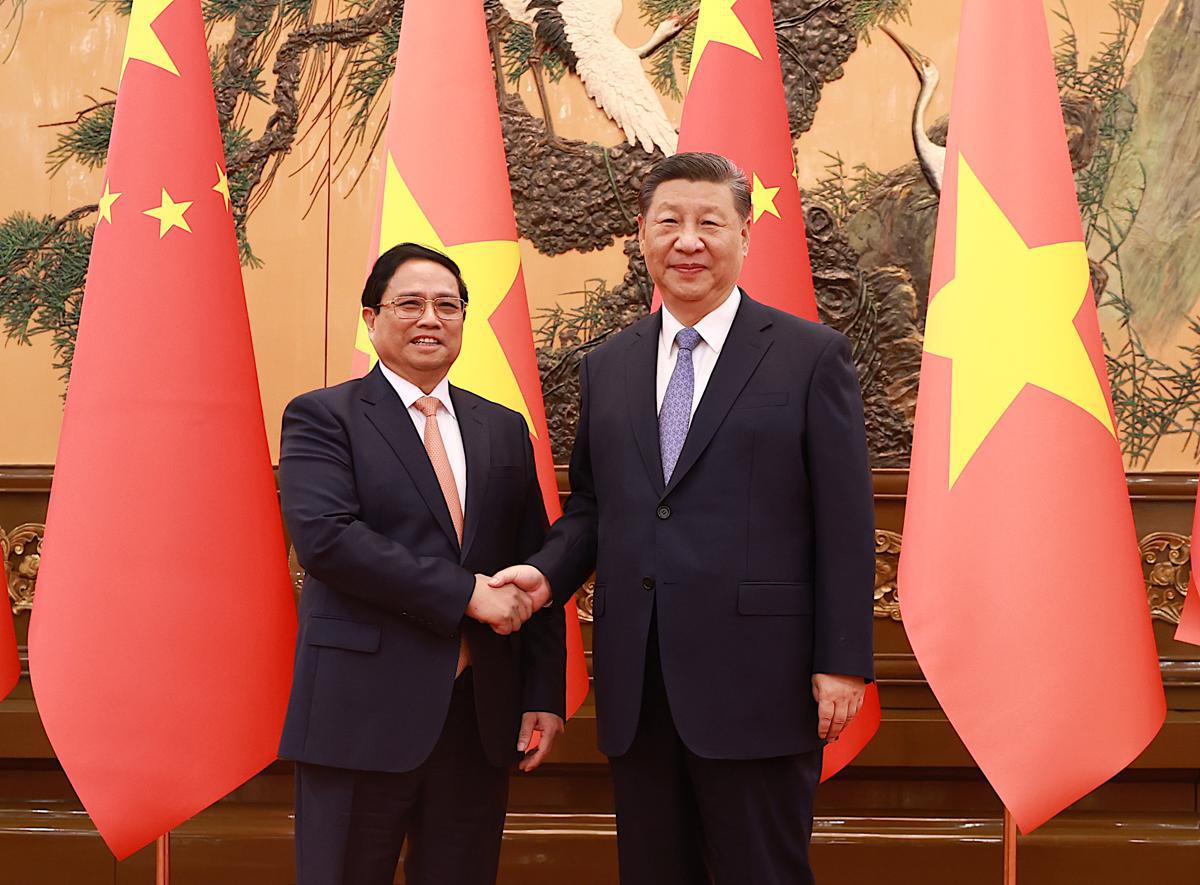 President Xi Jinping shakes hands with Vietnamese Prime Minister Pham Minh Chinh at the Great Hall of the People in Beijing on Wednesday. (FENG YONGBIN/China Daily)