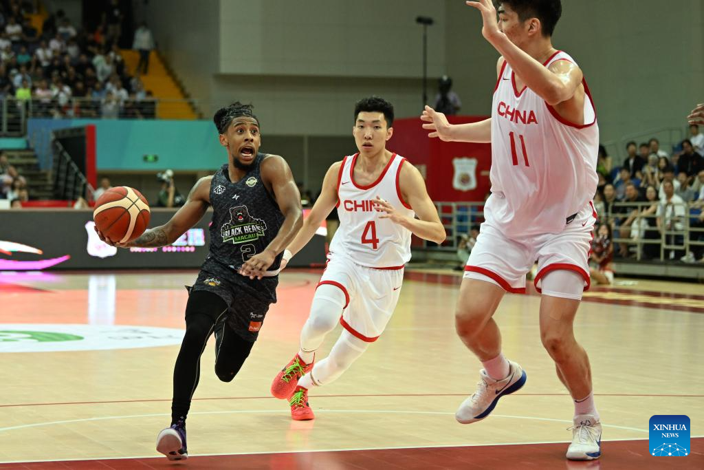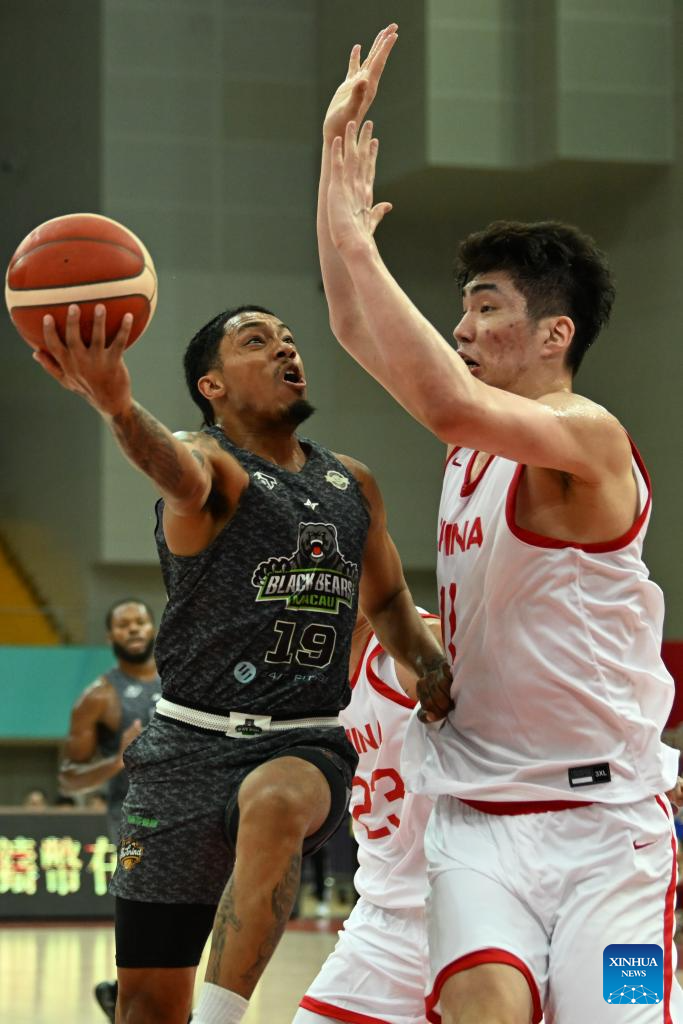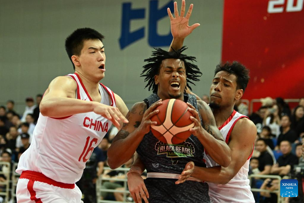 Niven Antone Glover (C) of Macao Black Bears competes during a friendly match between China's men's national basketball team and Macao Black Bears in Kunshan, east China's Jiangsu Province, June 26, 2024. (Photo by Wang Xuzhong/Xinhua)