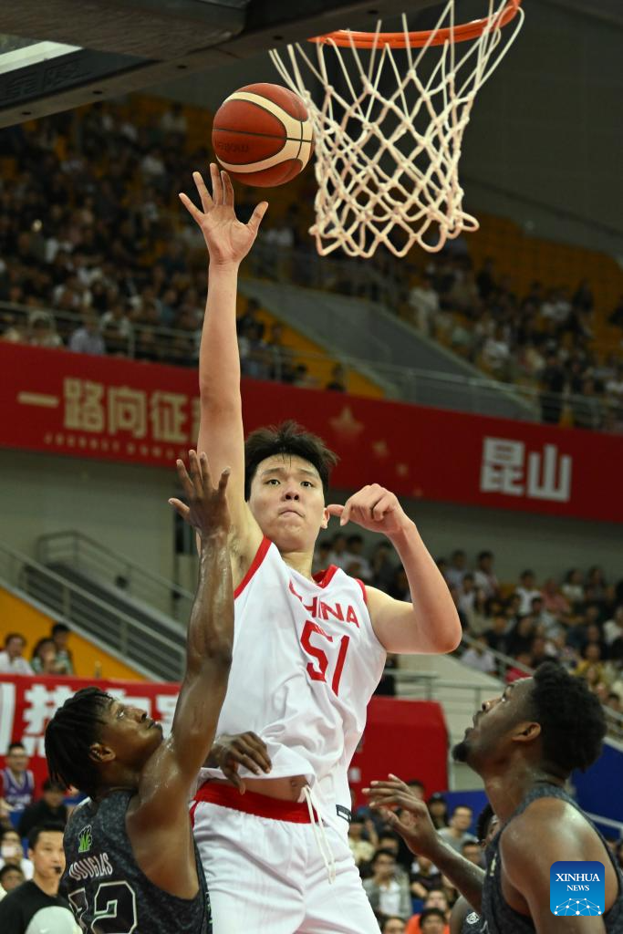 Jiao Boqiao (R) of China's men's national basketball team competes during a friendly match between China's men's national basketball team and Macao Black Bears in Kunshan, east China's Jiangsu Province, June 26, 2024. (Photo by Wang Xuzhong/Xinhua)