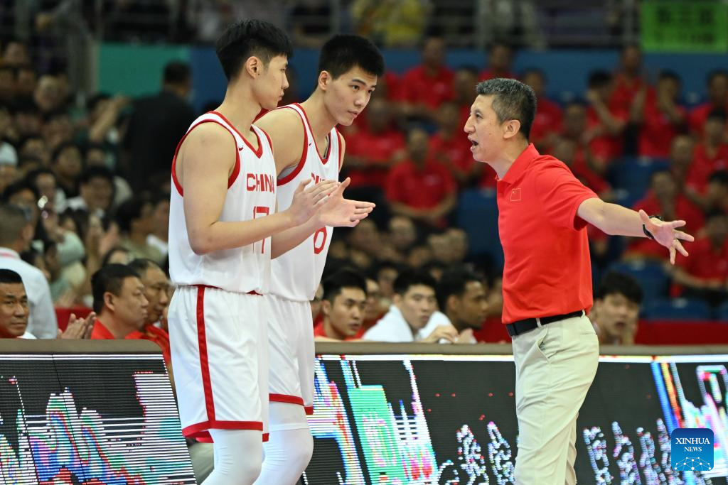 Acting head coach Guo Shiqiang (R) of China's men's national basketball team talks to players during a friendly match between China's men's national basketball team and Macao Black Bears in Kunshan, east China's Jiangsu Province, June 26, 2024. (Photo by Wang Xuzhong/Xinhua)