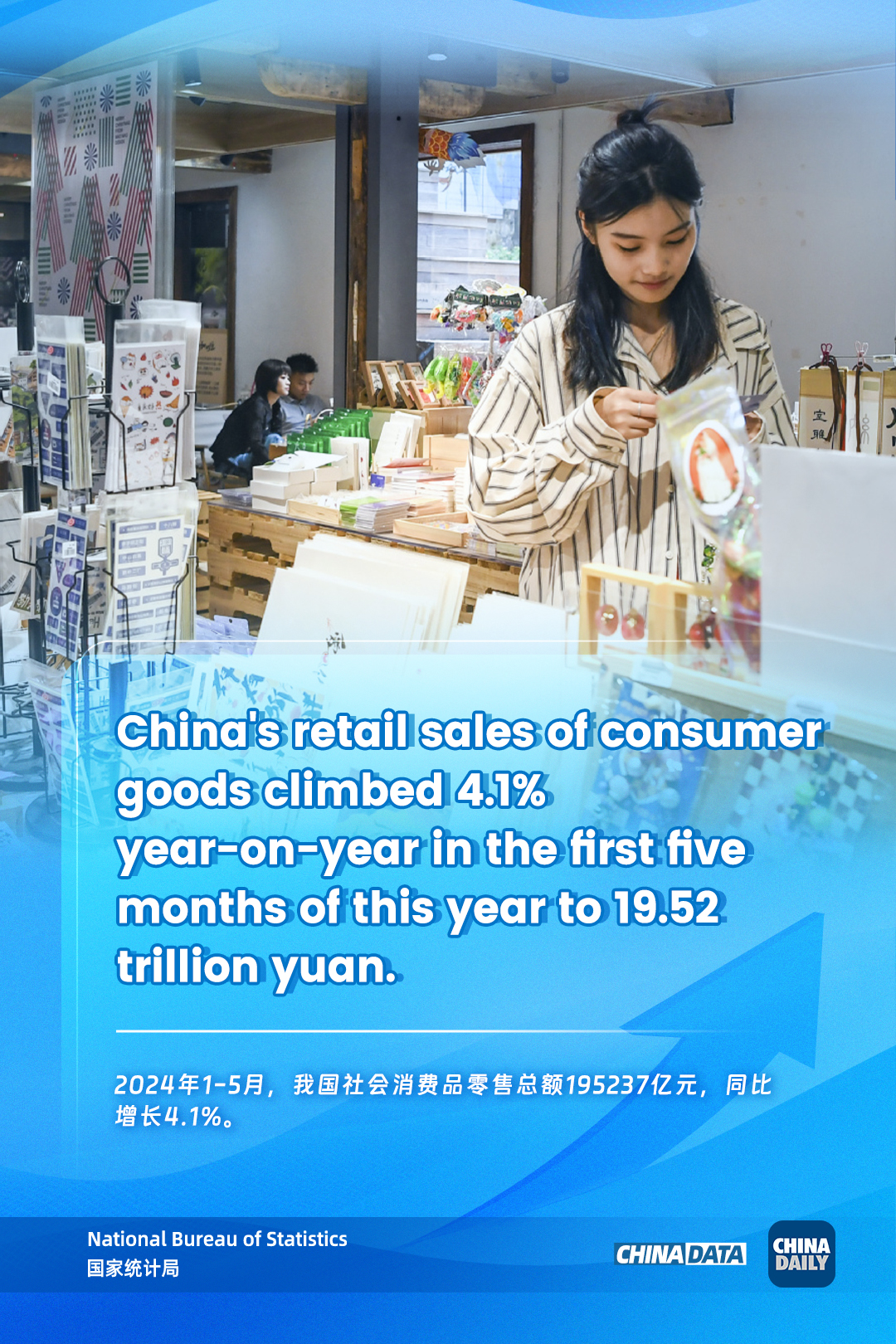 China's retail sales of consumer goods, a major indicator of the country's consumption strength, climbed 4.1 percent year-on-year in the first five months of this year, data from the National Bureau of Statistics showed.