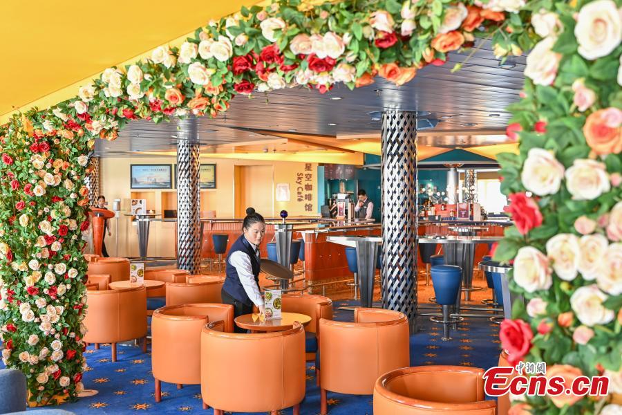 The staff tidy up the dining room on the cruise ship on June 25. (Photo: China News Service/Chen Jimin)
