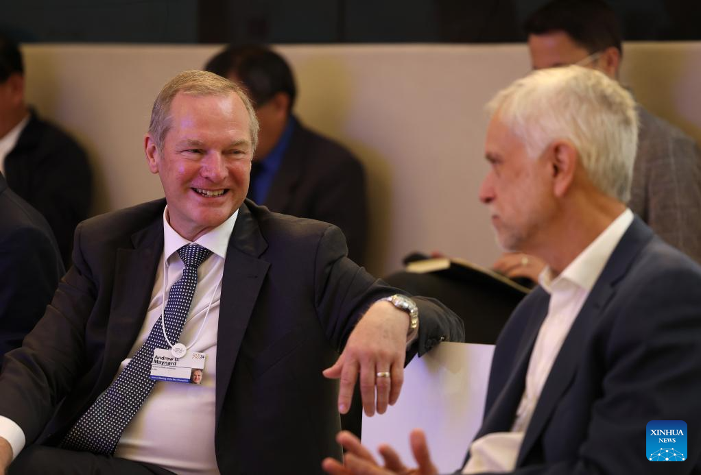 Participants talk to each other during the 15th Annual Meeting of the New Champions, also known as the Summer Davos, at the Dalian International Conference Center in Dalian, northeast China's Liaoning Province, June 26, 2024. Featuring the theme "Next Frontiers for Growth," the event, held from June 25 to 27, gathers over 1,700 leading figures from the public and private sectors in more than 100 countries and regions to jointly explore new drivers and pathways for global economic growth. (Xinhua/Yao Jianfeng)