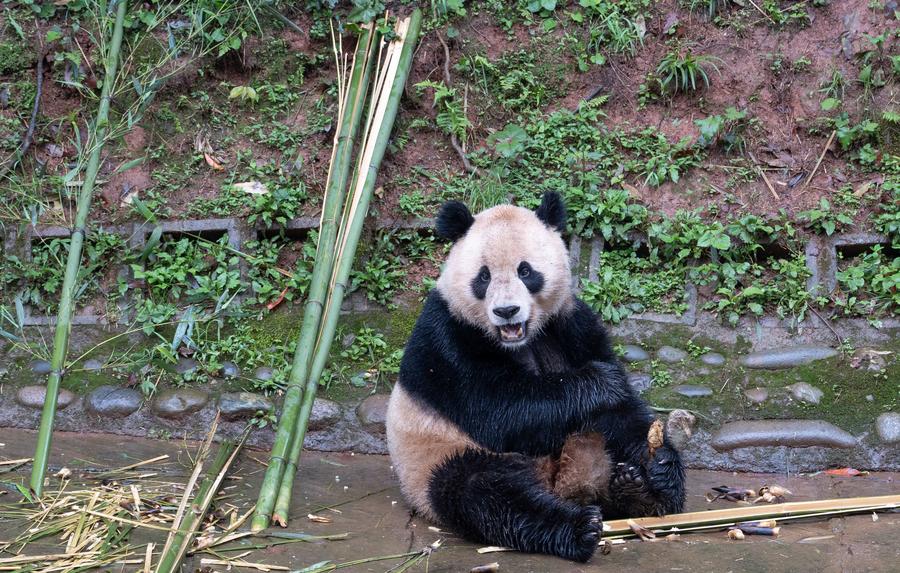 This photo taken on April 18, 2024, shows giant panda Xin Bao at the Bifengxia Panda Base of the China Conservation and Research Center for the Giant Panda in Ya'an, southwest China's Sichuan Province. (Xinhua/Xue Chen)
