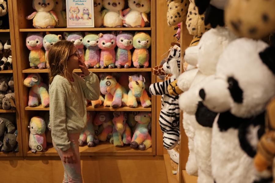 A girl visits a gift shop with giant panda-themed plushies at the San Diego Zoo in San Diego, California, the United States, on Feb. 22, 2024. (Photo by Zeng Hui/Xinhua)