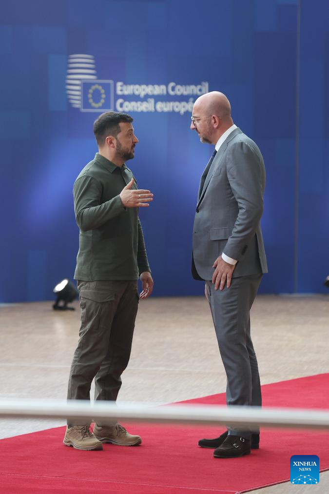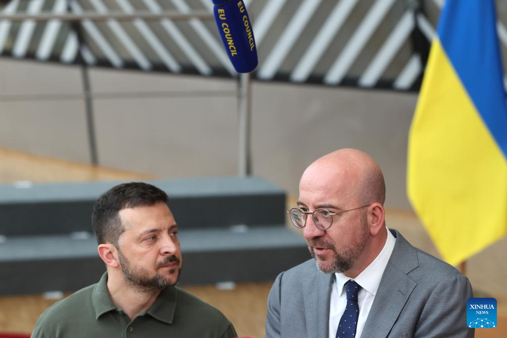 European Council President Charles Michel (R) talks with Ukrainian President Volodymyr Zelensky before a European Council summit in Brussels, Belgium, June 27, 2024. (Xinhua/Zhao Dingzhe)