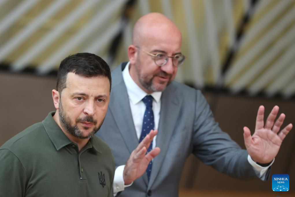 European Council President Charles Michel (R) and Ukrainian President Volodymyr Zelensky prepare to speak to the media before a European Council summit in Brussels, Belgium, June 27, 2024. (Xinhua/Zhao Dingzhe)