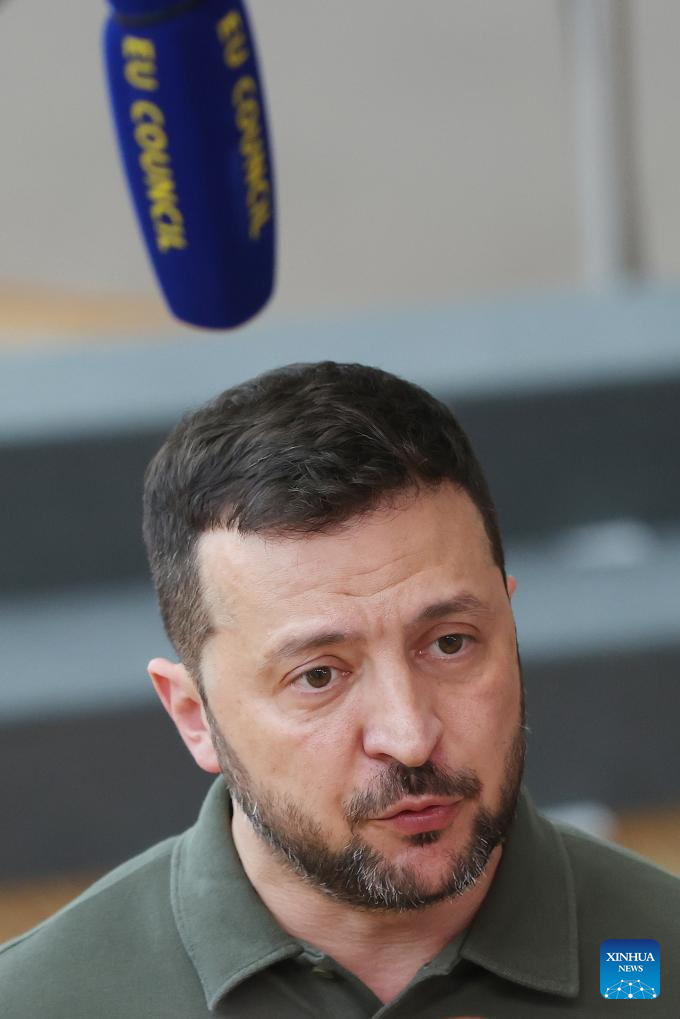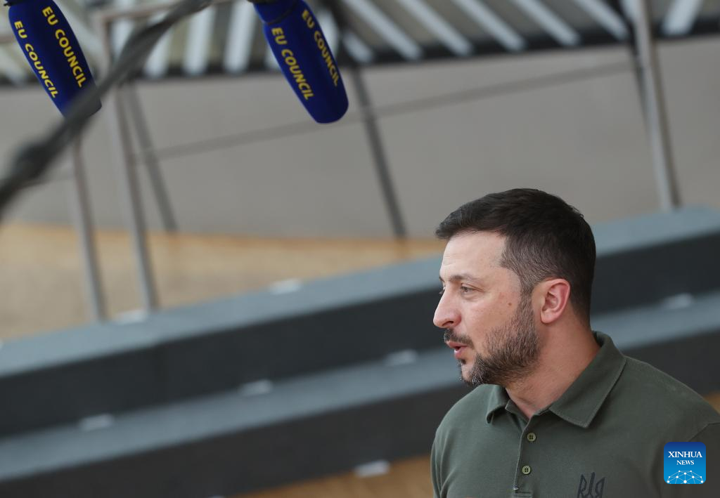 Ukrainian President Volodymyr Zelensky speaks to the media before a European Council summit in Brussels, Belgium, June 27, 2024. (Xinhua/Zhao Dingzhe)