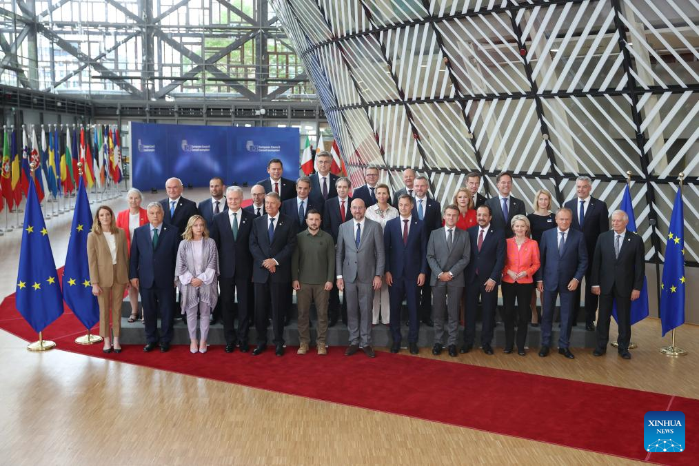 Attendees pose for a group photo before a European Council summit in Brussels, Belgium, June 27, 2024. (Xinhua/Zhao Dingzhe)