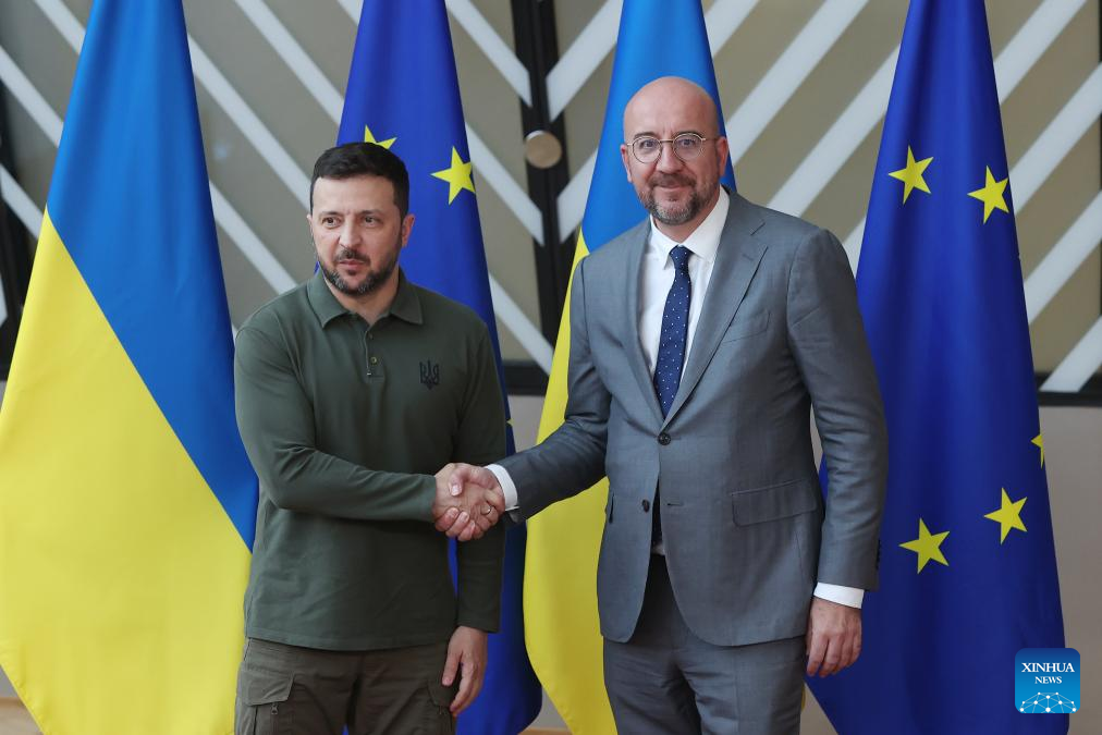 European Council President Charles Michel (R) shakes hands with Ukrainian President Volodymyr Zelensky before a European Council summit in Brussels, Belgium, June 27, 2024. (Xinhua/Zhao Dingzhe)