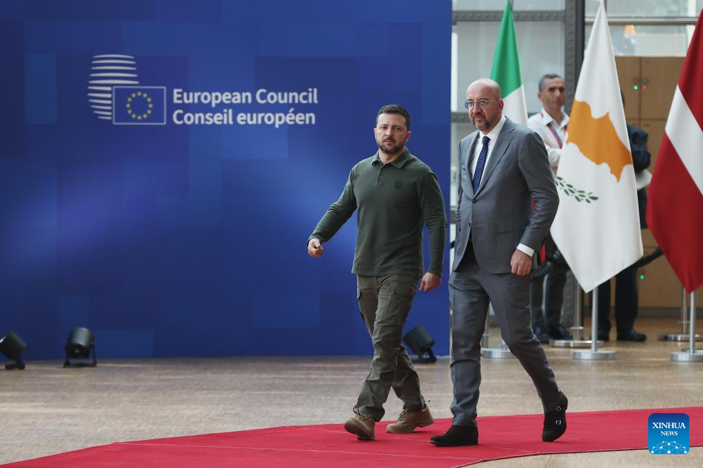 European Council President Charles Michel (R) and Ukrainian President Volodymyr Zelensky arrive for a European Council summit in Brussels, Belgium, June 27, 2024. (Xinhua/Zhao Dingzhe)