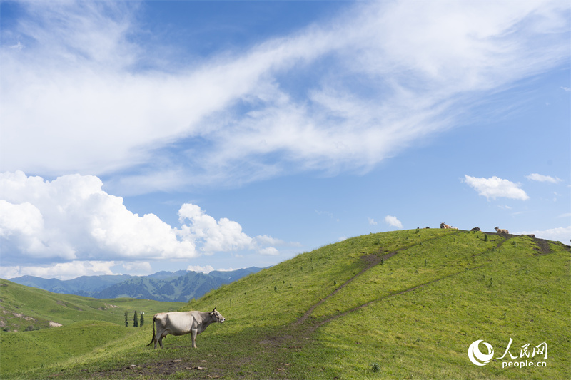 Xinjiang brown cattle roam the Tangbula Grassland in Ili Kazakh Autonomous Prefecture, northwest China's Xinjiang Uygur Autonomous Region. (People's Daily Online/Chang Sha)