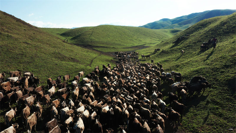 In June, Xinjiang brown cattle roam the Tangbula Grassland, one of the primary production areas for Xinjiang brown cattle, in Ili Kazakh Autonomous Prefecture, northwest China's Xinjiang Uygur Autonomous Region.