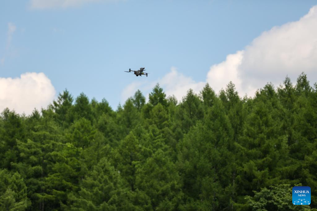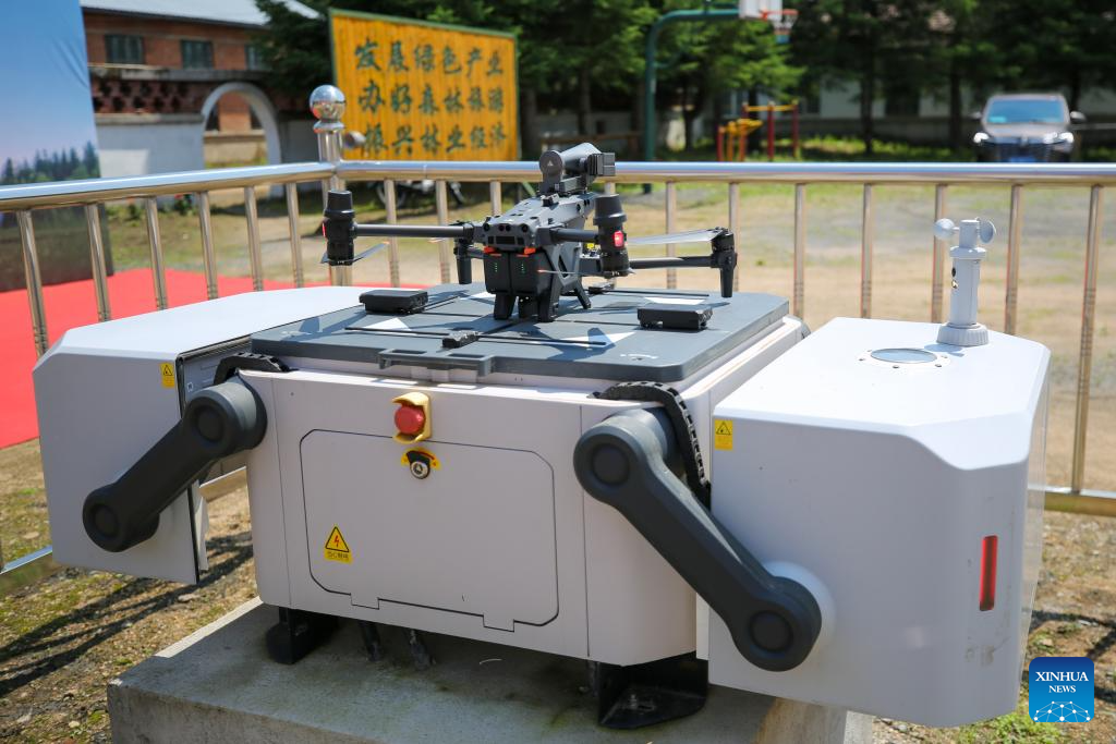 This photo taken on June 27, 2024 shows a drone for forest patrolling at Dailing forestry bureau in Yichun, northeast China's Heilongjiang Province. Recently, the Dailing forestry bureau has integrated advanced technology to enhance forestry management. By deploying drones, the bureau has achieved intelligent and automated forest patrolling, significantly reducing disaster risks and improving patrol efficiency. (Xinhua/Wang Yiliang)