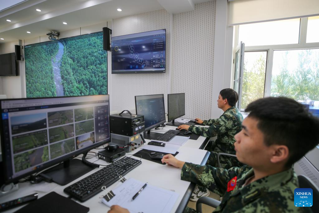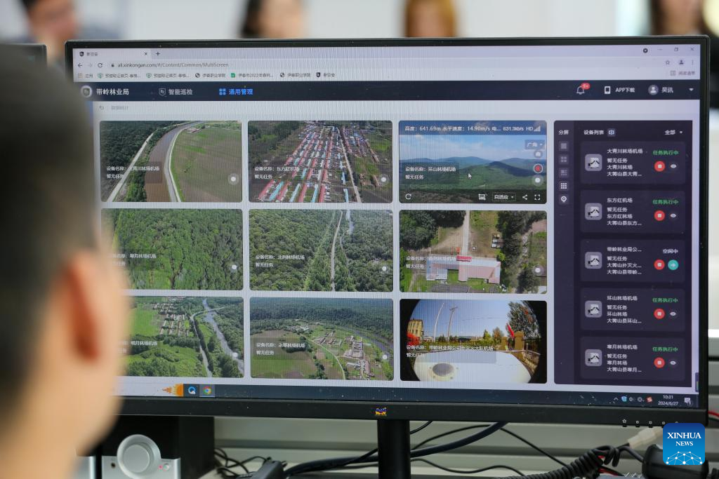Staff members control drones for forest patrolling via an intelligent inspection system at the control room of Dailing forestry bureau in Yichun, northeast China's Heilongjiang Province, June 27, 2024. Recently, the Dailing forestry bureau has integrated advanced technology to enhance forestry management. By deploying drones, the bureau has achieved intelligent and automated forest patrolling, significantly reducing disaster risks and improving patrol efficiency. (Xinhua/Wang Yiliang)