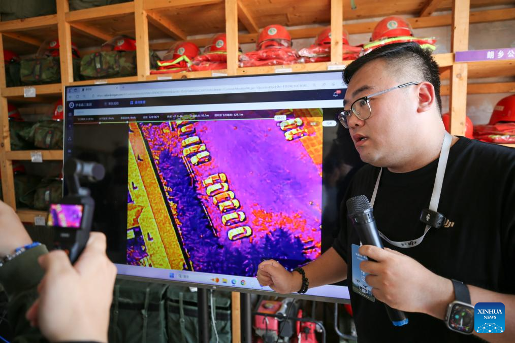 A staff member from DJI introduces thermal imaging for drone forest patrolling at Dailing forestry bureau in Yichun, northeast China's Heilongjiang Province, June 27, 2024. Recently, the Dailing forestry bureau has integrated advanced technology to enhance forestry management. By deploying drones, the bureau has achieved intelligent and automated forest patrolling, significantly reducing disaster risks and improving patrol efficiency. (Xinhua/Wang Yiliang)