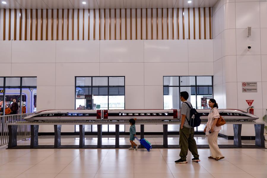 Passengers view a model of a high-speed electrical multiple unit (EMU) train of the Jakarta-Bandung high-speed railway at the waiting hall of Halim Station in Jakarta, Indonesia, June 17, 2024. (Xinhua/Xu Qin)