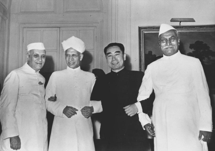 A group photo of Chinese Premier Zhou Enlai, Indian President Rajendra Prasad (first from right), Indian Vice President Sarvapalli Radhakrishnan (second from right) and Indian Prime Minister Jawaharlal Nehru taken in the last ten-day period of June 1954 on the occasion of Premier Zhou's visit to India. The joint communique signed by the two sides on June 28 initiated the Five Principles of Peaceful Coexistence. Xinhua photo (June 18, 1994)