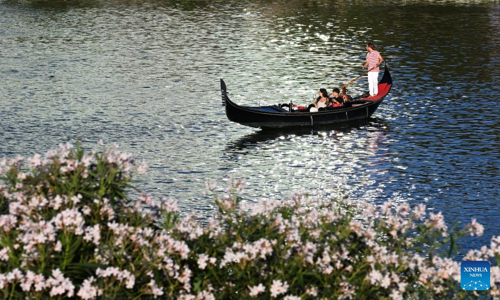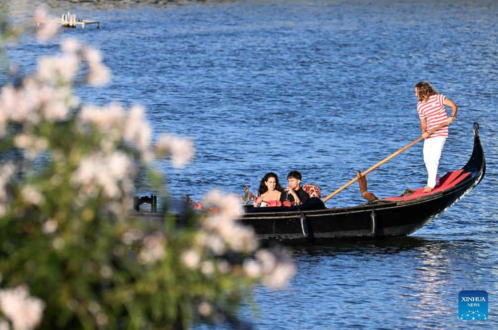 People sail on a Gondola, a typical traditional rowing boat of Venice, on a lake in Rome, Italy, June 26, 2024. (Photo by Alberto Lingria/Xinhua)