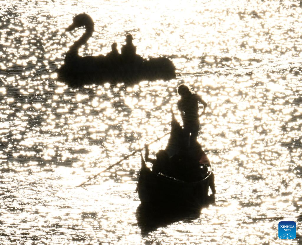 People sail on a Gondola (front), a typical traditional rowing boat of Venice, on a lake in Rome, Italy, June 26, 2024. (Photo by Alberto Lingria/Xinhua)