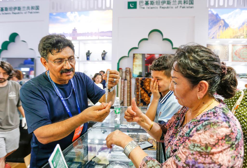 Visitors select jewelry at the booth of Pakistan during the 8th China-Eurasia Expo in Urumqi, northwest China's Xinjiang Uygur Autonomous Region, June 27, 2024.(Xinhua/Chen Shuo)