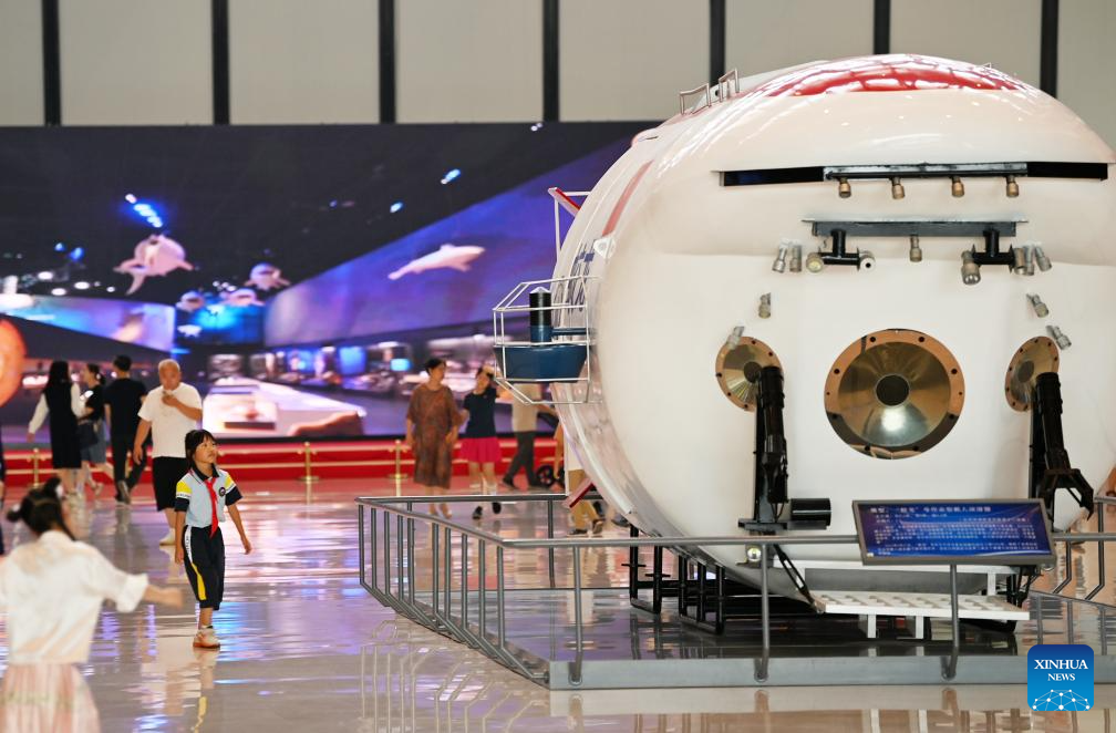People watch a model of Jiaolong, China's deep-sea manned submersible, at the National Maritime Museum of China in Tianjin, north China, June 28, 2024. The National Maritime Museum of China is located in Tianjin Binhai New Area, covering an area of 15 hectares. As the summer vacation approaches, the number of visitors to the museum has increased. (Xinhua/Li Ran)