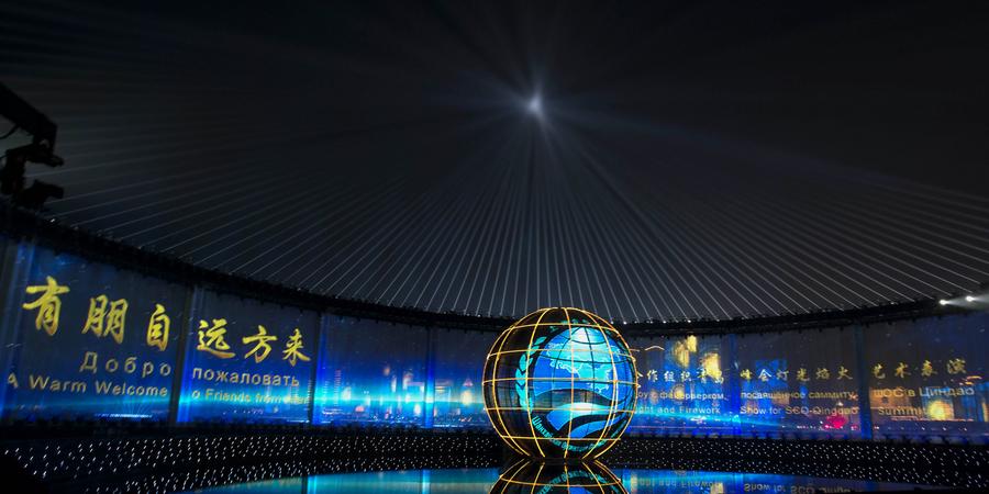 A lights and fireworks show takes place in Qingdao, the host city of the 18th Shanghai Cooperation Organization summit, in east China's Shandong Province, June 9, 2018. (Xinhua/Li Xueren)