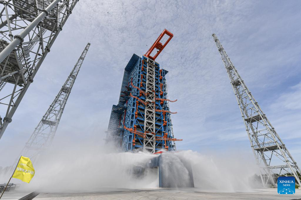 This photo taken on June 30, 2024 shows a scene during a rocket launch simulation rehearsal at the commercial spacecraft launch site in south China's Hainan Province. China's first commercial spacecraft launch site is ready for operations in south China's Hainan Province as of Sunday, having completed a rocket launch simulation rehearsal using its two launch pads. (Xinhua/Pu Xiaoxu)