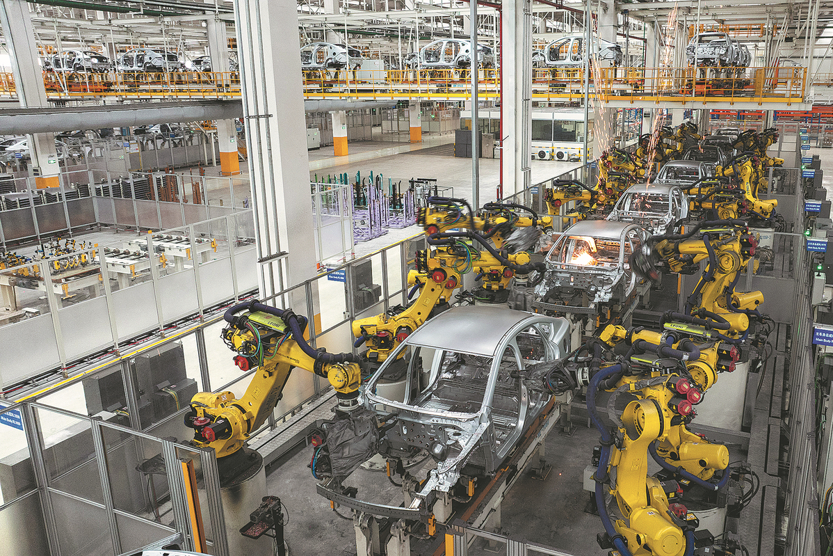 Robot arms seen at a production line of BYD in Changsha, Hunan province. (CHEN SIHAN/XINHUA)