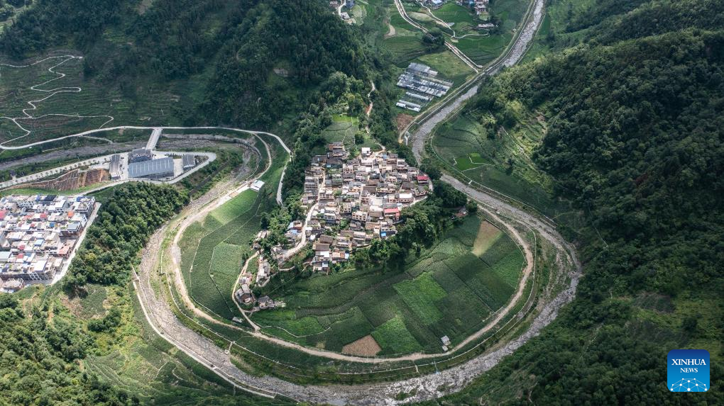 An aerial drone photo taken on June 26, 2024 shows a rural road in Huamao Village of Fengxiang Township, Zunyi City, southwest China's Guizhou Province. In the past ten years, the rural road network in Guizhou Province has been significantly improved. By the end of 2023, the total mileage of rural roads in Guizhou has reached 185,000 kilometers. (Xinhua/Tao Liang)